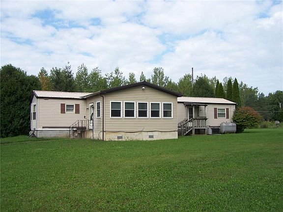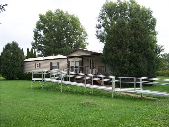 Very well maintained single wide mobile home with addition and 2 car detached garage on 6+ acres in the country. Many updates in the last 8-10 years including a nice oak kitchen with kitchen appliances included! Generous road setback, aluminum ramp to deck & front door, central air, & approximately 8 year old steel roof. The garage is insulated & has extra rooms for storage or other uses. The addition is a beautiful enclosed porch with heat overlooking the countryside.