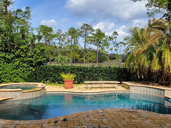 Completed in 2006, this Hidden Hills CC custom pool home wows with clean, contemporary style. Location is tops, too... about 1/2 acre surrounded by beautiful oak and fruit trees and holes 1 and 2 of the Arnold Palmer Signature-design course. Modern open plan, high ceilings, exceptional wood and stone flooring, quality finishes like rounded corner beads, fully-cased windows and transoms, kitchen loaded with options, fireplace with gas starter, simply beautiful oversized owner's suite (huge walk-in custom closet, stone bathroom floors & shower, sitting area opening to the pool), 3-car garage. Designed by famed Jacksonville architect Jack Diamond, this light-filled 1-story home feels larger than the stated sf. Walls of glass bring in the outdoors! 3brs, one used as office (missing 1 br pic).