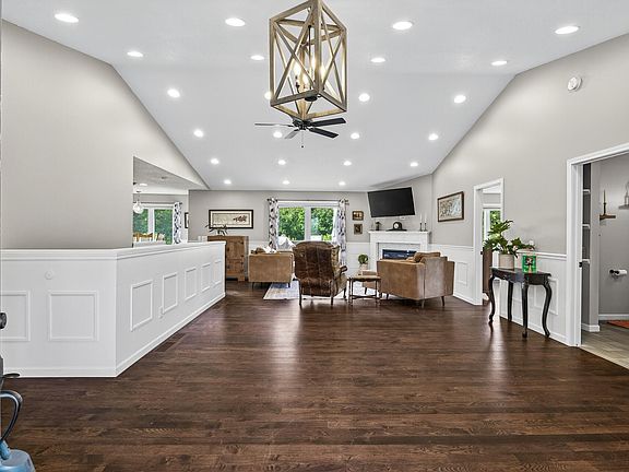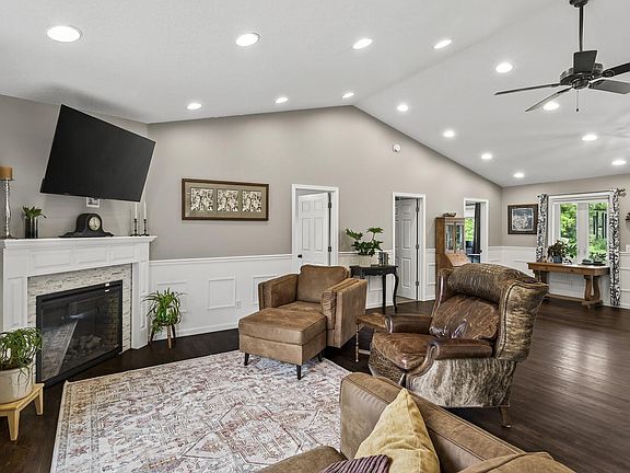Beautiful 4BR/3BA rambler set on 2 acres with over 3,000 finished sq ft! This home offers a bright and open layout with modern upgrades throughout-hardwood and tile flooring, vaulted ceilings, recessed lighting, and a cozy fireplace. The kitchen features stainless steel appliances, solid-surface countertops, a walk-in pantry, and direct access to the deck. The main level includes 2 spacious bedrooms, 2 full baths with tile finishes, a welcoming foyer, and a versatile pantry space that could also serve as a second laundry area. The lower level provides an expansive family room with a walkout to the backyard, a full bath, laundry, flex room/office, and a computer nook that could easily transition into a future bar or kitchenette. Enjoy outdoor living with a covered front porch, a back deck overlooking country views, and a 3-car insulated garage. All bathrooms are full-sized, and the large windows throughout invite natural light into every room. Conveniently located close to town with easy access to I-35, shopping, restaurants, parks, and the nearby bike path-this home blends the peace of the country living with the convenience of city amenities.