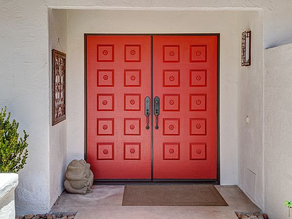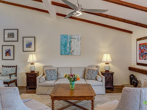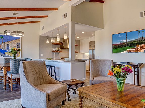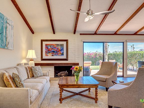Beautifully remodeled 3 bdr/3 bed home located at the top of exclusive Thunderbird Villas with sweeping views of the valley and surrounding mountains. Brand new kitchen with top of the line stainless steel appliances (GE), quartzite counter tops, custom cabinetry and built-in breakfast bar. Vaulted ceilings in living room w/fireplace, walls of glass that look out over back yard with spectacular views and custom shades. High quality tile floors run throughout the entire home. Bathrooms have been upgraded with quartzite counter tops and new fixtures. Master bedroom has a Diakin HVAC wall unit for added comfort & closet build-ins. New A/C and heating system installed as well as all new duct work.Two car garage has epoxy floors and new custom storage cabinetry. Community pool is steps away from home and is surrounded by the majestic mountains for extra privacy. HOA includes guard gate,on-site mgmt., landscaping, cable TV and trash. This house is stunning and in immaculate condition!