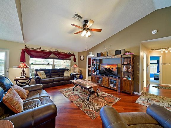 What a great house in a family friendly neighborhood. The home with a fenced rear yard overlooks a small lake. The large lanai area is perfect for those pool parties or quiet reflection. The home has hardwood and tile in the living areas with carpet in all the bedrooms. The garage is extra deep at 24 feet giving someone room for bikes and a workshop. The rare front porch in Florida is reminiscent of the days gone by. Look at this one before it is gone.