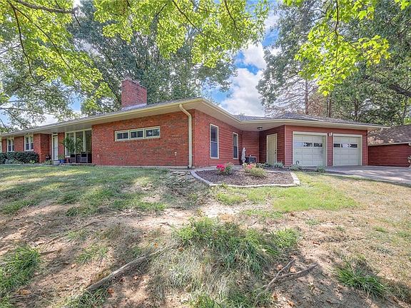 Take in breathtaking sunrises and sunsets from the front porch or back deck of this solid ranch-style home, perfectly positioned on 4.58 acres within city limits.This spacious home offers 5 bedrooms and 2 full baths, along with an abundance of storage throughout. The kitchen features custom stained cabinetry, a center island, pantry, and granite countertops, perfect for everyday living or entertaining. The formal dining room includes a beautiful atrium door that opens to a private, ground level deck. Enjoy cozy evenings in the formal living room with its masonry fireplace, and take advantage of the additional den for extra living space. The main floor includes the primary bedroom plus three more bedrooms, great for guests, offices, or hobbies. Downstairs, you'll find a fifth bedroom, another full bath, and a fantastic entertainment area complete with a wet bar, island seating, and a tiled bar setup. The home features dual-zone HVAC for year round comfort. Outside, a generous 2 car garage offers built-in storage cabinets, a workbench, and walkout access to the yard. You'll also find a garden shed and a Bobcat mower for easy property maintenance. What truly sets this property apart is the land, it’s spacious, versatile, and full of possibilities: