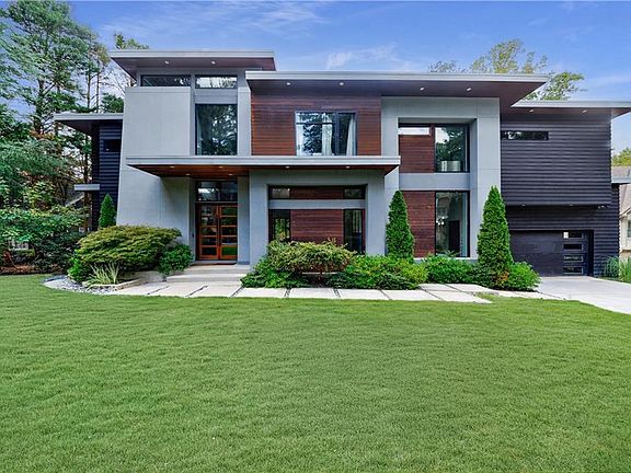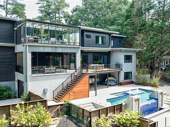 Tucked away on a quiet, tree-lined street in the heart of Buckhead, this exceptional modern residence sits on a private and expansive 0.83+/-acre lot—just minutes from top-rated schools, premier shopping, PATH 400, and all that Atlanta has to offer. From the moment you enter, the home captivates with its light-filled, open-concept main level, soaring ceilings, and clean, contemporary lines. The spacious great room seamlessly flows into a stunning chef’s kitchen, featuring a dramatic quartz waterfall island, top-of-the-line Miele and Sub-Zero appliances, custom soft-close cabinetry, and double ovens, including a steam oven. The main level offers a formal dining room, a dedicated home office, and a private guest suite with a full bath. A spacious two-car garage with soaring 16-foot ceilings is also located on this level, the garage already has an indoor basketball hoop but could also be transformed into a car lift system, making it a perfect fit for automotive enthusiasts or collectors. The two car garage is complete with two electric car chargers. Another feature of the home is a total of seven electric shades throughout the house, the electric shades on the main living area doors can remain open while keeping out the sun, insects etc. The two electric shades on the covered outdoor deck on the main level can transform the space from an open-air setting to a fully enclosed screened porch — a truly impressive and versatile feature. A modern staircase leads to the upper level, where you'll find three generously sized en-suite bedrooms, plus a versatile bonus room ideal as a second office or a fourth upstairs bedroom. The primary suite is a true retreat with a spacious walk-in closet and a luxurious spa-inspired bathroom, complete with a steam shower and Japanese insulated soaking tub—perfect for hot/cold plunge therapy. The finished terrace level includes a guest bedroom, home gym, media room, and an oversized single garage—an ideal setup for an au pair or in-law suite with private exterior access. Each level of the home offers seamless indoor-outdoor living, with over 2,000 square feet of deck and patio space. Step outside to your resort-style backyard oasis, where you'll find a breathtaking infinity-edge pool with waterfalls, integrated spa, fire pit, and a level lawn—perfect for play, entertaining, or simply relaxing in total privacy. Designed with sustainability and quality in mind, this home features a solar array with battery backup, spray foam insulation, and energy-efficient windows for optimal comfort and efficiency. Premium materials include a durable TPO roof, IPE wood cladding and decking, modern solid wood doors, architectural hard plank, and stucco exterior—blending cutting-edge design with timeless craftsmanship.