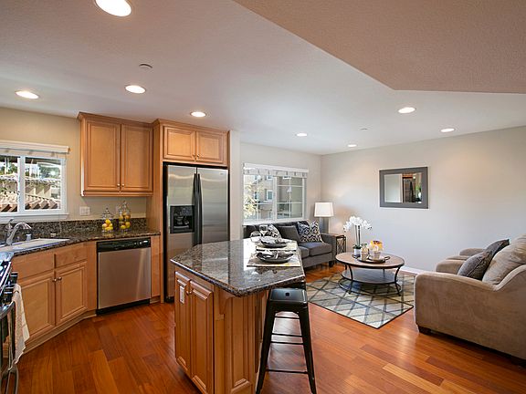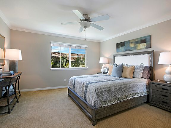 Enjoy the Carlsbad Lifestyle in this Immaculate, charming town home in the desirable newer coastal community of The Bluffs! Just the right touch of elegance and comfort, this bright 4 bedroom, 2.5 bath home features rich wood flooring, crown molding, open kitchen w/granite counters and island, spacious rooms and generous storage. 2 car attached garage. Walking distance to scenic Agua Hedionda Lagoon, close to freeways, Carlsbad Village and popular beaches! First time on the market, this stunning 1842 square foot home was built in 2007 and is nestled in a prime interior location overlooking expansive green belt and mature trees, well manicured landscape and a private patio to enjoy this peaceful setting. Fresh neutral paint throughout makes this home move-in ready! Spacious floor plan includes open concept living and dining roomw/coffered ceilings, extensive windows and recessed lighting, cozy fireplace w/mantel. Entertain in style with open gourmet kitchen that features stainless steel appliances, granite counters and island and generous storage including pull-outs in the pantry. Family/Flex room is off kitchen for maximum design options. Guest/Powder room and deep closet that wraps under stairs complete the main level. Relax and unwind in the Master Suite complete w/mirrored walk-in closet and large window to enjoy pleasant views and breezes. Master Bath features deep Jacuzzi tub, dual sinks, travertine shower and tile floor. Secondary bedrooms, Bath w/granite counters and glass enclosed travertine framed tub and linen space complete the second level. Two car garage has direct access to large 4 th bedroom/private office that boasts oversized closet and laundry area. All bedrooms have ceiling fans w/lighting. A/C. Low HOA! Beautifully maintained, newer community offers pool, spa, Clubhouse that can be rented for parties and gatherings, RV/Boat/Jet Ski rental space available, Bocci and Volleyball. Live the good life at 4037 Bluff View Way!