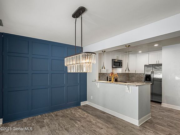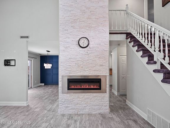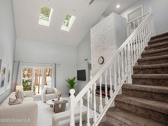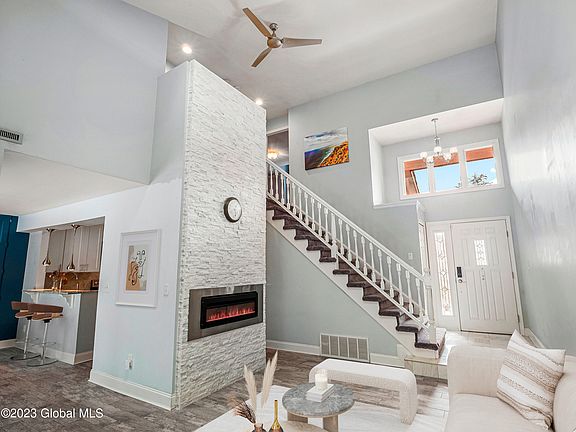 Luxury 2 bedroom townhome situated on a quiet cul-de-sac within the desirable Guilderland SD! Tastefully renovated throughout, this home offers 2 Bedrooms, 1.5 baths, modern kitchen with custom cabinets, tiled backsplash, SS appliances, granite countertops and central air. Vaulted ceiling living room w/ 2 skylights and a quartz stacked fireplace, offering ample natural lighting. 1st floor laundry with newer full size Smart LG W/D. Modern baths with custom tile/marble finishings. Porcelain tile flooring on main level. The master boasts of 2 walk-in closets with an attached powder room. HOA takes care of snow removal, garbage pick up and lawncare! Impeccably maintained and an absolute must see! Very close to Crossgates Mall, a short drive to downtown Albany and easy access to I-890 and I-87.