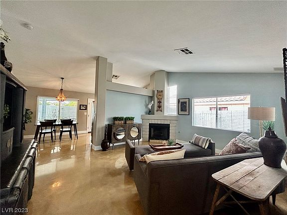 Do not miss this beautifully updated single-story home, it is a relaxing desert oasis in the midst of Sin City! Enjoy pink sunsets and mountain views from the secluded outdoor living space, perfect for a tranquil night at home or entertaining pool side. Take advantage of the two covered patios year-round equipped with an overhead fan, fire pit, and an area to sunbathe. The ADU is a perfect She Shed, Man Cave, Office, Pool House, or Guest Space, it is air conditioned and heated with a new mini split. Can't agree on TV? No worries, the primary suite has its own living area complete with mounted smart TV that rotates to view from bed, and door straight out to the hot tub. Large lot with real grass in front keeps the property cool with vibrant orange blooms all summer attracting the hummingbirds. Plenty of space to park an RV boat or work truck on a quiet cul-de-sac. All this plus the new semi-custom kitchen, modern sparkling epoxy floors, vaulted ceilings, lots of storage space.