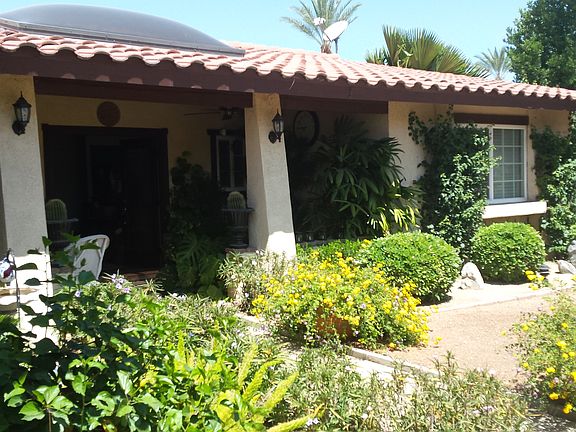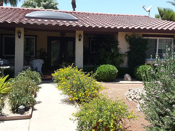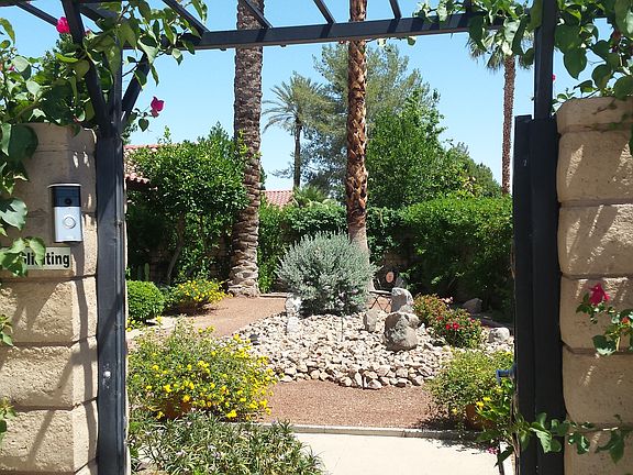 Welcome home to this lovely cul-de-sac single family residence in the Sagewood tract! From the time you enter through the private gated entry you'll be impressed! The large enclosed front courtyard features desert landscaping and a covered porch with skylight to enjoy the warm desert evenings. Upon entering the home you'll appreciate the attention to detail with easy care laminate floors and Thermapane windows throughout the home. The remodeled kitchen is a chef's dream with beautiful tile countertops, newer stainless steel LG appliances, 5 burner gas range and ample storage in the refinished cabinets. Each of the generous-sized bedrooms have built in closet storage space. The primary bedroom features French doors to the outside and an expansive attached bathroom closed off from the bedroom for privacy with dual vanities and large soaking tub. Through any of the three French doors in the home - all with glass enclosed shutters - enter the backyard which is an entertainers delight to enjoy the sunsets in the newly renovated pool, covered porch with skylights and fans and lush landscaping. From front to back, this home is your own (very) private oasis! For fun take the neighborhood pathway a short distance to dine at Si Bon, Sherman's Deli, Grill-a-Burger, Starbucks and shop at Albertsons or Bristol Farms. Close to College of the Desert with low HOA and community features what more could you want!