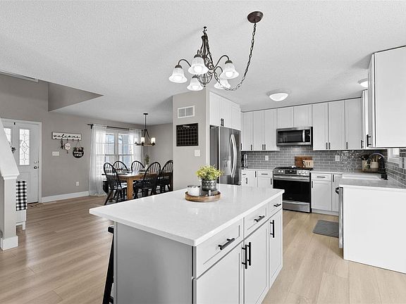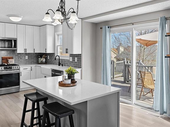 Beautifully updated & tastefully appointed 3 bedroom, 3.5 bath home w/ over 2,500 sq. ft. of living space. The open concept feel of the main level is highlighted by a contemporary kitchen w/ quartz counters, new stainless steel appliances w/ gas range, center island, updated cabinets/hardware & luxury vinyl plank flooring. Entertain guests in the spacious dining & living rooms & the finished, walk out basement provides a great add. living space w/ large rec area, bar top, sleeping room/office, full bath, & plenty of storage. The 2nd floor features a master bedroom suite w/ walk-in closet & master bathroom w/ separate tub & shower & dual sinks. Step outside to the newer, maintenance free composite deck overlooking the partially fenced backyard to enjoy afternoons & an evening BBQ. Add. features include newer architectural shingle roof ('21), main floor laundry, fresh paint throughout, newer HVAC & so much more! Neighborhood pools, walking trails, sports fields & easy access to highways!