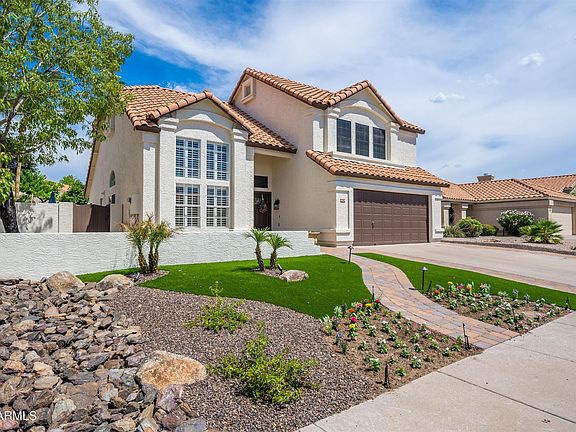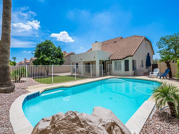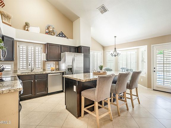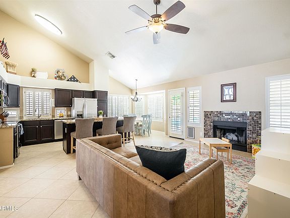 Marvelous home in Red Mountain Ranch that starts with curb appeal to the max! Then enter to soaring ceiling, white wood shutters and abundant tile flooring. The family room features a mosaic tiled fireplace and is open to the kitchen. In the kitchen discover mocha cabinetry, granite countertops, a stainless steel appliance package, decorator ledge and a breakfast bar. Cozy eat-in area with a view! The popular downstairs master suite includes double door entry, separate shower and tub, granite counters, Travertine tile, a walk-in closet and an exit to the backyard. Upstairs there are two more bedrooms and a bonus loft! Step outside to a beautifully manicured yard with a fenced sparkling play pool, grassy play area and a covered patio. Close to highways, schools, hiking, shopping and dining.