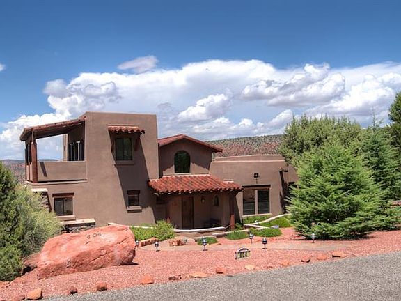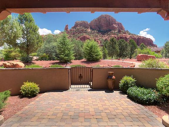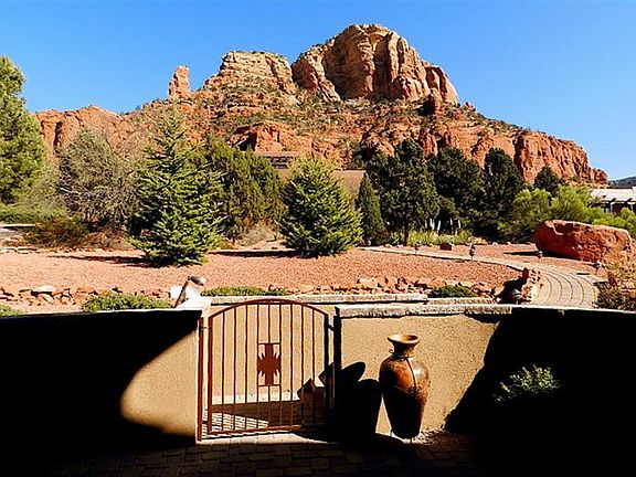 Residential, Santa Fe/Pueblo,Southwest - Sedona, AZ Located in upscale Mystic Hills, this house was custom designed by Matt Dugan, showcasing architectural details which add so much warmth and character. The living room is set on a radius with log-beamed ceiling and large windows focused on views of Cathedral Rock. Elephant Rock looms over the front of the house. Distressed wooden floors of hickory grace the living room, dining and kitchen great room area. Soft golden shades of travertine welcome visitors at the entry. Arched doors and windows add hints of Old Spain. A beautiful curved staircase leads to an upstairs guest suite with private viewing deck. Beautiful SW design and colors flow throughout. The back patio, paved in stone with views of Cathedral Rock, is centered around the large kiva fireplace for cozy evening entertaining. 3 bedrooms, 3 bathrooms, a den/office room, and 3 outdoor areas complete the plan. HOA Club house, swimming pool/spa, & tennis. Make it a point to see this house if you are seeking the Spirit of Sedona.