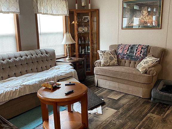 Immaculate, nearly new 3 bedroom, 2 full bath Colony DT1009 Sectional Home with insulated skirting, composite decking, central air, all new utility connections, 1 stall garage with brand new door, all on a manageable, level lot with fenced in area. Home has an open floor plan with vinyl throughout the main living area for easy clean up, carpet in bedrooms. Hickory style cabinetry throughout, large island in kitchen with pendant lights, Skyview Wall in kitchen and great room with transom windows, large walk-in closet in master bedroom, 1pc fiberglass round front garden tub in master bath, boot bench in utility room in matching hickory style. All appliances included.