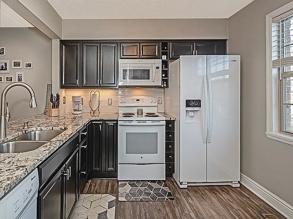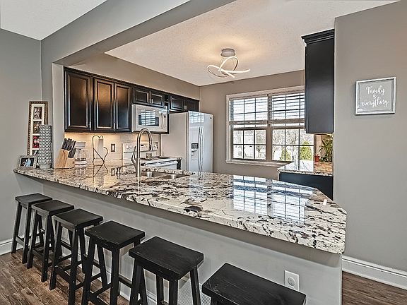 Beautifully updated! Wow what a welcoming entry! You will be impressed with the openness and modern touches. Imagine cooking/entertaining in this new kitchen! Stylist black and white granite counters is striking against the new dark cabinets. Tiled back splash, new modern lighting. Wait... counter seating for six! Enjoy the newer luxury vinyl floors throughout. Large dining room offers new recessed lights. Relaxing and spacious living room with back yard views. Enjoy the outdoors on your back patio and walk out to the back yard. Powder room finishes off the main level. New wood steps lead upstairs to the two large bedrooms with their own lovely bathrooms and nice sized closets! New lighting brightens the hallway upstairs which is great since the laundry was moved to upstairs between the bedrooms. The basement was recently finished in 2022 and being used as an office. 2 car garage! Home is across from the gazebo on the cul-de-sac! Close to the "T" parks, restaurants and shopping.