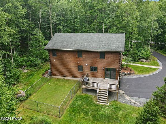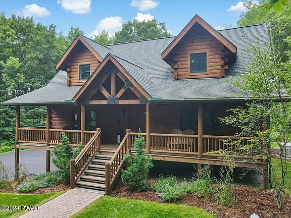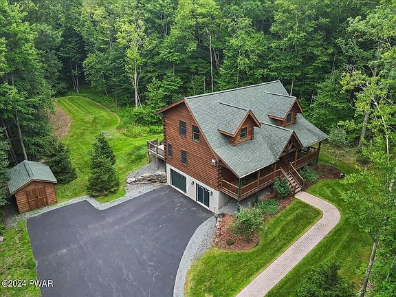 Exquisite Custom Log Chalet on two acres is a FEAST FOR THE EYES and includes basic furniture! This meticulously kept landscaped home Nestled at the end of a very private long paved driveway, offers tranquility and comfort. Follow the brick-faced walkway to the front covered rocking chair porch then enter into an entry with the open floor plan that boasts an immense great room with stone faced propane fireplace, cathedral ceilings with pegged Tongue and groove beams throughout, Granite kitchen counters featuring gas stove appliances and center island. Primary suite on the main floor with walk-in closet, plus two additional bedrooms upstairs and a versatile family room loft. The home already has the Generator installed, central A/C, superior walls, and Pecs plumbing adding ease of finishing the lower level two rooms with an already finished garage. The back sun deck overlooks the beautiful grassy yard. A secluded oasis yet minutes to Hawley & Lake Wallenpaupack.