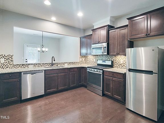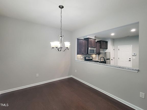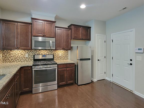 Classic and classy, this two-story townhome is in a nearly perfect location on the edge of Research Triangle Park. Located in Wake County, the delightful Village at the Park neighborhood is inside the city limits of Cary, and is nestled between Morrisville, Cary, Durham, and the RTP boundary. It is close to numerous major employers, and major regional highways including I-540, I-40, I-885, NC55, NC54. Nine miles to RDU International Airport. The Streets at Southpoint is six miles away. Jordan Lake Recreation Area is nearby, as are numerous golf courses, major grocery retailers, the Durham Bulls Athletic Park, the Durham Performing Arts Center. The townhome is nicely appointed inside and out with a stacked stone façade, vinyl siding and brick on the sides and back, private backyard with patio, and two-car garage. The kitchen is spacious and includes a gas range, built-in microwave, granite countertops, staggered-height raised-panel cherry cabinets, tile backsplash, hardwood floor, recessed lighting, refrigerator, dishwasher, garbage disposal, and a pantry. A raised pass-thru-style opening between the kitchen and the dining room makes entertaining a joy. The living room is spacious and has connections for your electronics. The dining room and living room overlook the verdant backyard. A powder room with pedestal sink is located on the main level. Upstairs you will find three generously-sized bedrooms and two full baths. The primary suite has a spa-like en suite bath and an enormous walk-in closet. Both second-floor baths, and the laundry room, have custom tile floors. The main level has hardwood flooring throughout. Plush carpet upstairs in the bedrooms and hall. Note the attention to detail by the builder including wrought-iron spindles on the stairs, crown molding on the kitchen cabinets, and Craftsman-style interior doors. Security system installed. Window blinds are installed. Smart thermostats. Living room and bedrooms are prewired for ceiling fans. The neighborhood has a centrally-located pocket park with benches and a paved walking path. Driveway parking and visitor spaces are available for your guests. The HOA handles the landscape care. The home has been newly painted inside and is move-in ready. All that's missing is you! Some assigned base schools may have enrollment caps. Contact your assigned base school with questions about enrolling.