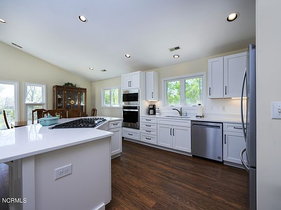This amazing Neuse Riverfront home on almost an acre offers breathtaking views throughout, impeccable updates, a private beach and beautiful landscaping located in a great neighborhood! As you pull onto the property past the beautiful Azalea, notice the well kept exterior of the home that has freshly painted porches and steps. The open living space is great to entertain and boast a whole new kitchen to include quartz countertops, custom cabinets and stainless steel appliances. Four spacious bedrooms, the master suite includes 2 closets, a balcony facing the river, dual vanities, a walk-in shower and large jetted tub. Multiple places to relax outside include balconies, a patio and screened in porch or take a walk into the back yard and enjoy playing on the sandy beach. In the neighborhood you can enjoy pools, tennis courts, parks and horse stables are take a quick tip to the Crystal Coast and Historic Downtown New Bern. A new on-demand water heater, workspace in the attached 2 car garage and a nice storage shed are all additional features of this amazing home. Schedule your private showing today as this home will not last long!