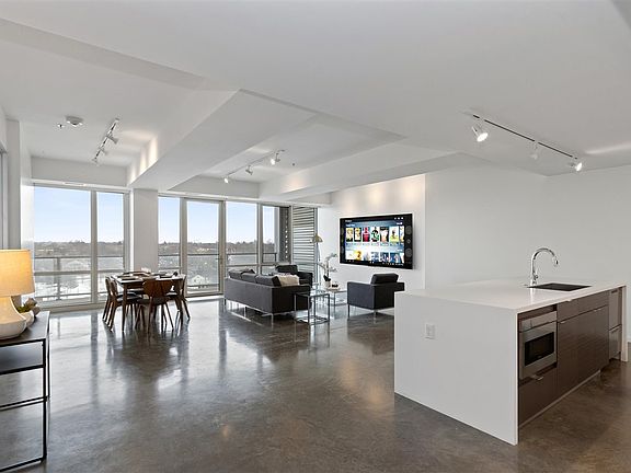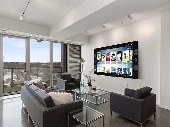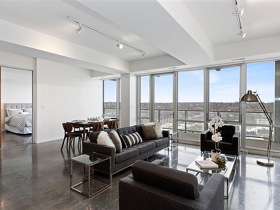 Live amid everything downtown Iowa City has to offer. This handsome condominium on the ninth floor of The Chauncey offers a voluminous open floor plan. Solid doors with a horizontal grain walnut veneer add a MidCentruy accent to this contemporary styled condo with aluminum trimmed doors, polished concrete floors, and white counters. A striking kitchen and a large island complete with a breakfast bar and waterfall counter look out to the large living area, covered balcony, and Eastern Iowa City. Designer appliances by Fisher Paykel include a double-dish drawer dishwasher, refrigerator, oven, induction cooktop. A unique drawer-style microwave by Sharp is conveniently located on the island. A Zephyr vent hood pulls out above the cooktop for light and venting. Custom-built cabinetry by McComas Lacina Construction includes white uppers and grey base cabinets. An expansive main living area allows the living and dining rooms to flow together. Perfect for everyday living or formal entertaining. The large covered balcony can be accessed from the main living area. Large windows in aluminum frames usher morning light and are complete with remote-controlled blinds. A powder room with floating vanity is located off the main living area. Accessed through an attractive pocket door, the primary suite is a perfect getaway with a large walk-in closet and ensuite bathroom with modern fixtures and timeless white tile. The balcony can also be accessed from the primary suite. Listing price includes exclusive use of parking space 19 in the underground garage. Amenities abound in The Chauncey, which is home to FilmScene Cinema, SpareMe bowling alley/arcade/bistro, Fix coffee shop, Hotel Chauncey, and a 5th-floor roof terrace and workout facility. The building is adjacent to Chauncey Swan park.