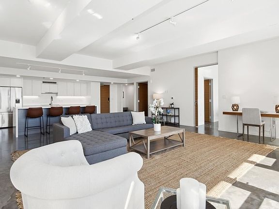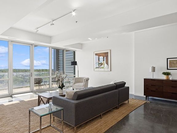 This 14th-floor condo offers chic living in Downtown Iowa City and incomparable amenities. An open floor plan layout lets you savor expansive views of the College Green Historic District throughout this unit. Polished concrete floors, aluminum framed windows, contemporary lighting, and sleek cabinetry make this space undeniably modern. A stylish kitchen anchors daily life in this open plan. White and gray custom cabinets with under-cabinet LED lighting are paired with white Corian counters to create a seamless modern palette. The large island offers a breakfast bar, sleek sink, and waterfall countertop. Kitchen appliances include a Fisher & Paykel oven and induction cooktop, Zephyr hood, Fisher & Paykel 36-inch French-door refrigerator-freezer, Sharp top-access microwave, and Fisher & Paykel double dish drawer dishwasher. This open plan offers flexibility when creating sitting and entertaining spaces. Regardless of placement, residents and guests will enjoy sweeping views of East Iowa City from living and dining areas. An expansive covered balcony is accessed off the main living area. The powder room has a floating vanity with walnut detailing and white Corian countertop. The primary suite is located through a pocket door with a distinctive horizontal grain walnut. The en-suite bath has a tiled rain shower, handsome floating vanity, and designer fixtures. The bedroom also has a large walk-in closet and offers access to the covered balcony. This condo also features Lutron switches and dimmers, floor outlets, hard-wired data jacks, contemporary track lighting, and sun-filtering shades. Includes one parking space in the secured underground garage.