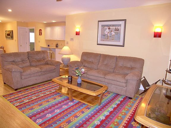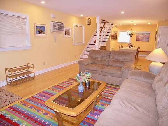 BEACH BLOCK 4 BEDROOM TOWNHOUSE - UNDER $400K! This is an opportunity not to be missed! This townhouse provides all the space you will need in an amazing location, at a great price point. Renovated in 2013 with all required permits and approvals, updates include new walls, floors, re-built stairs, electric, plumbing, heating furnace, A/C units, kitchen, lights, ceiling fans, and 3 exterior doors. There is nothing left to do but move in and enjoy this fully furnished townhome! The first floor includes a spacious living room and dining room with adorable shelving nook, upgraded with gorgeous hardwood flooring. You will love the recently remodeled kitchen with bright white, cheery cabinetry, counter seating, and tile flooring, and a back door for easy access to trash area. Also on this level is a bedroom with hardwood flooring and a connected full bathroom. The second floor includes two guest bedrooms - both a great size - with an extra sitting room at the top of the steps - perfect for a TV space, office area, etc. There is also a hall bath with tub. The master suite is very spacious with plenty of room for a king size bed plus sitting area, and it has its own connected large bath with tub. Closet space throughout gives you all the storage you need and to top it off, you have an amazing attached beach storage room with access both from the interior of this unit and the exterior- it's ideal for storing all of your beach gear, bikes and extra household items. With gas forced air heat and wall A/C units and ceiling fans throughout, you will be comfortable year round in this warm and inviting unit. Furnishings and appliances will be included, less some personal items and some decor. While there is not a rental history, this could be an incredible rental income producer due to the space offered and the outstanding location. One car assigned parking is included, and this is a pet friendly association. The condo fee covers the cost of exterior homeowners and flood insurances, water and sewer, and maintenance repairs ( recent examples include parking lot re-pavement, exterior painting, etc.). Complex amenities include laundry facilities, patio area with furniture, and additional storage. The roof of the building was new in January, 2020. Easy to show - call today!
