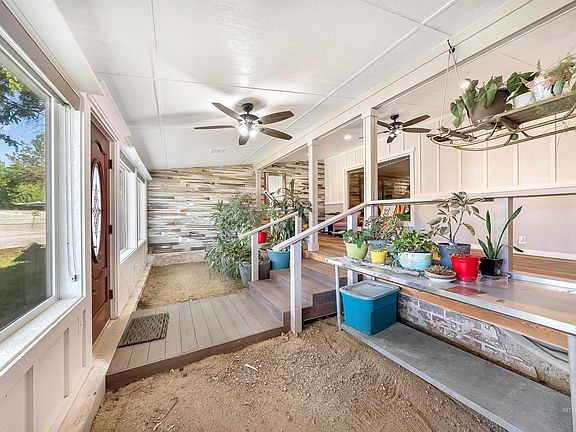 Main home offers a wood cabin-style living room complete with a fireplace. It has a spacious sunroom/greenhouse for houseplants or year round gardening. The kitchen boasts butcher block countertops and double oven. 1K sqft finished basement with 2nd fireplace and sump pump. Potential for additional bedrooms, bath, and storage downstairs. Home updates include new electric water heater 23', HVAC 23', new vinyl windows in most rooms, new exterior paint 24', and new roof in 2019. Large corner lot, fully fenced, offers street parking on both sides. Extra-long double wide driveway with RV hookup. Detached 2-car garage/shop connected to large commercial kitchen currently licensed by Central Health District. Park-style RV trailer with large bathroom and kitchen under metal roof. 10'x10' wooden storage shed with lights and outlets. 8'x40' Connex shipping container full of shelves with lights and outlets with alley access. Chicken coop, garden area, and mature grape vines with four varieties of sweet seedless grapes.