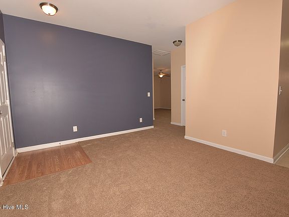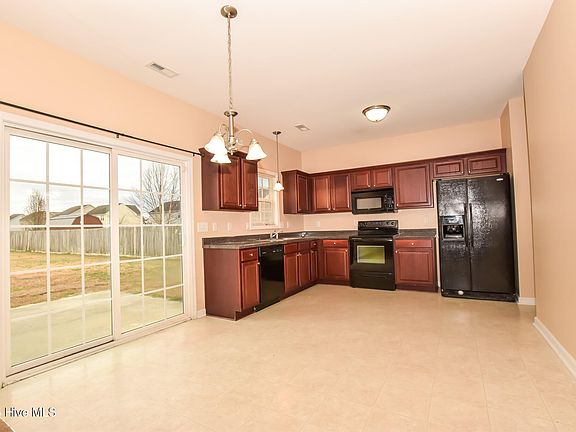 Covered front porch with room for a few pieces of patio furniture. You enter the home into the living room with a small wood floor landing. Through the living room is the kitchen with matching appliances to include a refrigerator, dishwasher, microwave hood, and electric glass top range. The family room has an electric fireplace and a cut out nook for a TV. The half bath is downstairs in between the living room and the kitchen/family room. Upstairs are 3 spare bedrooms that share a hallway full bath with twin sinks and shower/tub combo. The master bedroom has a vaulted ceiling, walk-in closet, and an on-suite bathroom with a garden tub, his and hers sinks, and walk-in shower. The sliding glass door in the kitchen leads to the patio in the fenced in backyard. Attached two car garage and driveway.