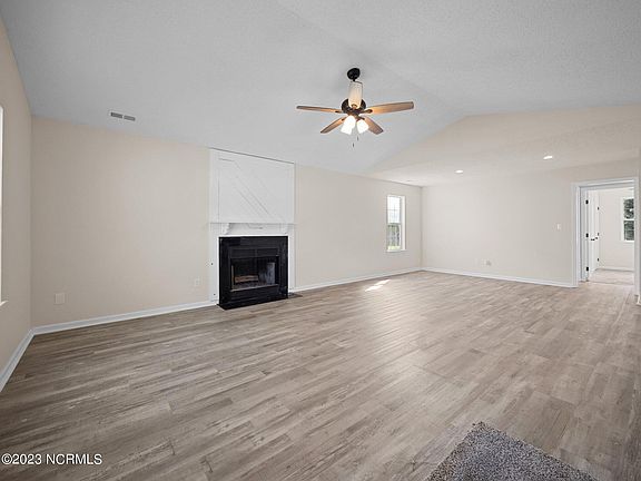 Welcome to 404 Hedgerow Lane! This charming 3-bedroom, 2-bathroom home has undergone a complete transformation, boasting an array of modern upgrades. The harmonious blend of neutral tones creates a serene ambiance throughout, making you feel right at home from the moment you step inside. You'll be captivated by the living room's vaulted ceilings and a charming fireplace, perfect for cozy evenings with loved ones. The galley style kitchen is a chef's dream, boasting modern stainless steel appliances that will make cooking a breeze. The master bedroom features a spacious walk-in closet and private en-suite, providing you with the perfect setting to unwind and relax. The two additional bedrooms are a great size! Beyond the back door, a large fenced-in backyard awaits, offering endless possibilities for outdoor enjoyment! The included shed adds valuable storage space for all your gardening and hobby needs. Nestled on a peaceful cul-de-sac beyond city limits - No HOA or city taxes! Close to Camp Lejeune, shopping and schools. Don't miss the opportunity to call this adorable home your own!