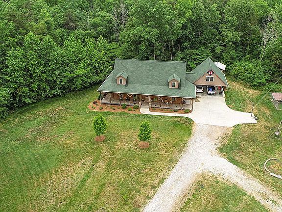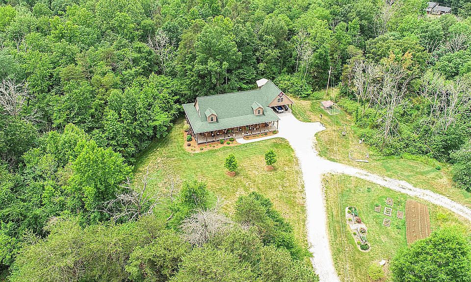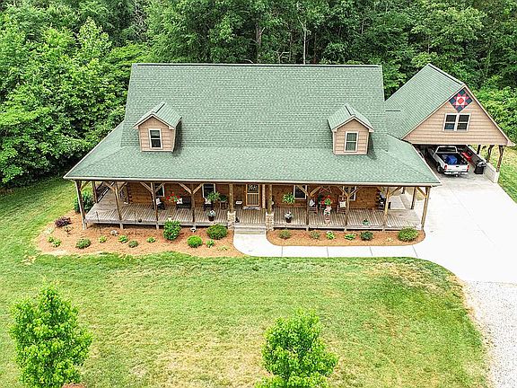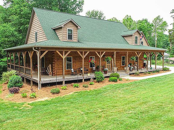 Stunning log cabin on 7.6 acres built in 2016 where privacy abounds. 4 bedrooms, 3 full bathroom, primary on the main, loft space and large closets. Wrap around covered porch, oversized 2 car carport, large storage room above carport, and established garden space with raised beds. Walk in to a 2 story living room with floor to ceiling stone gas fireplace . Open concept first floor allows for easy entertaining. Living room adjoins dining space with bay window with built in seating/storage. Dining space flows naturally into large kitchen with farmhouse sink, 5 burner gas range, double oven, walk-in pantry, & ample cabinet and counter space. On the main floor you will also find 2nd bedroom, a full guest bath, and huge laundry room with custom cabinets and large utility sink. Wander upstairs to find expansive loft with built in bookshelves, two ceiling fans, and natural light from the large windows. Two upstairs bedrooms offer massive closets with additional built-in shelving along with eave storage and window seats with storage.