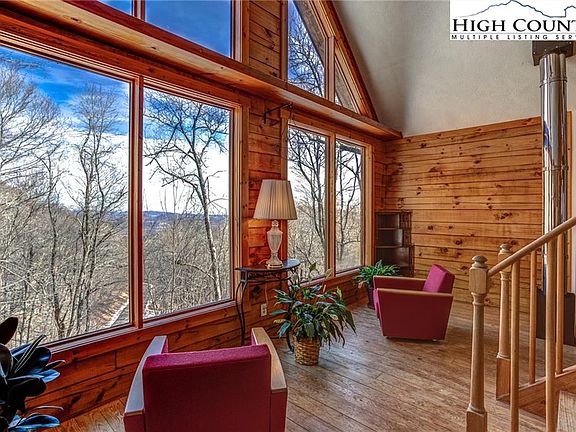 Classic log cabin nestled on 2 acres in the Blue Ridge Mountains of Ashe County. Rustic yet spacious, this 2,300+ sq. ft. home includes 3 bedrooms, bonus room, and 2 full baths with loft. Enjoy the gorgeous mountain view and natural light pouring through floor-to-ceiling windows. Master suite on this level includes a whirlpool tub and access to the wrap-around deck, where you can hear the rushing creek flowing below. Main level features vaulted ceilings, hardwood flooring, master, kitchen, and dining. The loft above could function as a home office or additional sleeping space. Full finished basement includes 2 bedrooms, family room, rec room (use as a pool table or bunk room), laundry, and outdoor access. Paved driveway leads to 2-car garage, while lower driveway winds up property for access to creek and basement level. Peaceful neighborhood with great access, minutes from MountainAire Golf Course. Feels secluded, but is only a short drive to downtown West Jefferson. This home would make an idyllic full-time residence, or would be a great vacation property.