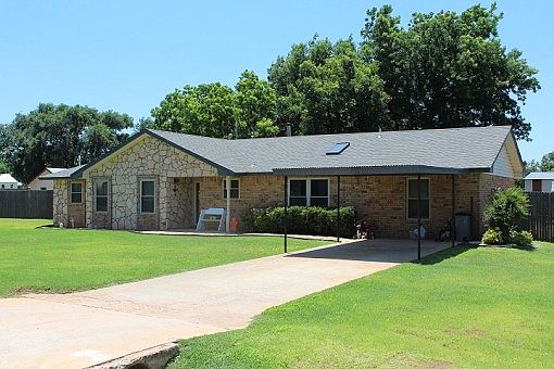 This is a great home that sits on a large corner lot that is just under an acre. Home features an open floor plan, two living areas, large master bathroom with double vanities and spacious walk in closet. Kitchen has newer tile back splash, stainless steel gas stove and bar seating. Living room has a wood burning fireplace. Newer tilt in windows. Great back patio with pergola, pecan trees, storage shed and storm shelter. This home is a must see! Call Stacey Carnes 580-821-4804 for additional information.