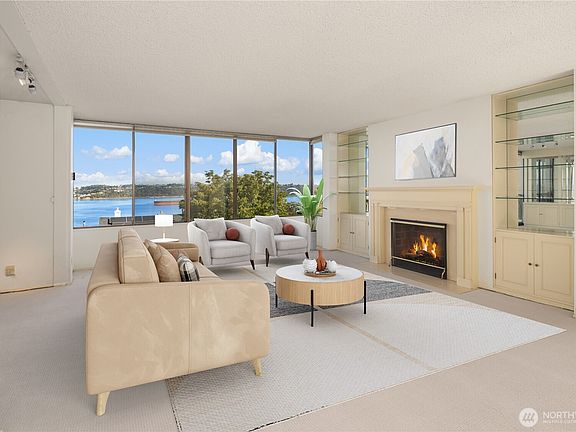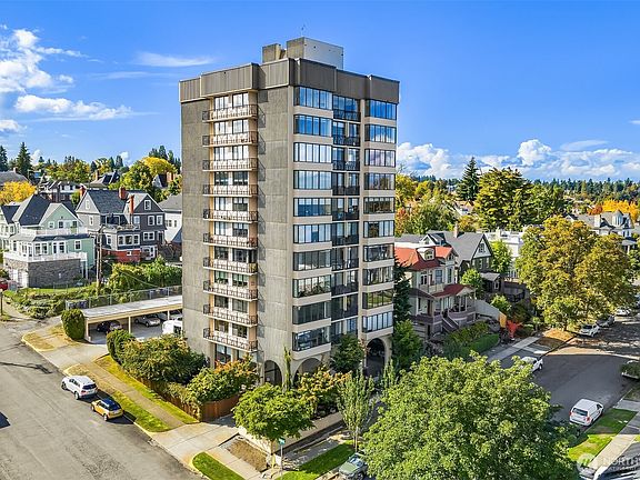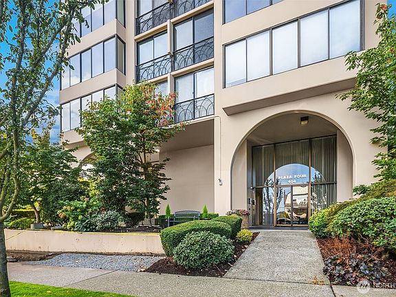First time on the market! This rare Plaza Four residence spans the entire S side of the building, offering privacy w/only one other unit on the floor. Featuring 2BD+DEN /2BA showcasing sweeping 180° views from Vashon to Mt Rainier through walls of windows & 3 private balconies. The flexible layout includes a spacious living/dining w/fireplace, primary w/walk-in closet, & large 2nd BD/versatile den. Freshly painted w/new carpet, it’s move-in ready yet primed for a remodel to reflect your style. Amenities incl secure access w/onsite manager, clubroom, exercise, sauna, common patio, guest parking, plus a convenient pull-through drive. Ideally located in the walkable Stadium District near shops, dining, hospitals, transit, & light rail.