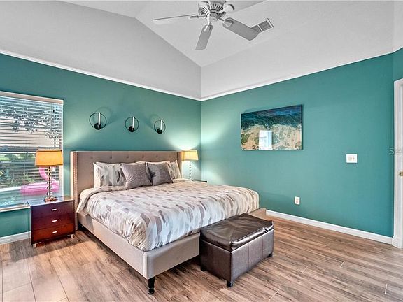 Welcome home to 404 Obo Street! This gorgeous 3 bedroom 2 bath POOL HOME is located just minutes from Davenport's popular Posner Park. The first thing you'll notice upon arrival is the corner lots unique shape which adds an element of privacy. The exterior features an oversized driveway, lush landscaping, full irrigation system, and a newer roof (2018). Upon entering the home you'll be welcomed by tall, vaulted ceilings and a bright and inviting design palette. The brand new laminate floors run throughout the entire house and really pop against the freshly painted interior. The open concept living space provides plenty of space for dining and entertaining. The kitchen features recessed lighting, all wood cabinets and stainless steel appliances. The house also features several gas appliances including the range, water heater, dryer and furnace. The master bedroom has a walk-in closet and a vaulted ceiling which really opens up the space. The large master bathroom includes access to the back patio. The back yard oasis is completely fenced for added privacy and is complete with fresh landscaping. Quarantine got you down? Come take a dip inside this fully screened-in pool with hot tub heated by a brand new gas water heater (2020). A perfect way to begin and end your days. Just a short drive to the attractions and minutes from fantastic shopping, dining and the main highways. This home has it all! Don't delay schedule your showing today!
