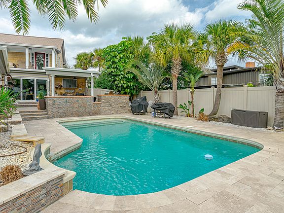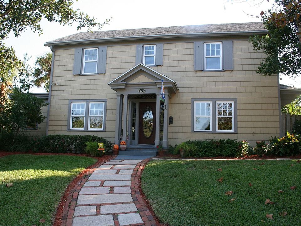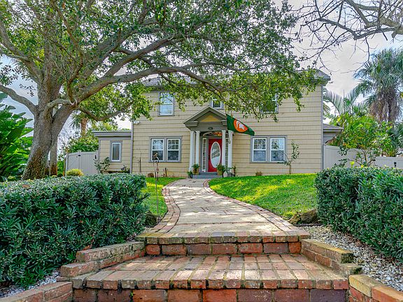 Own a piece of Daytona's history! This stunning home boasts quality and craftmanship; featuring original wood floors (sanded and refinished in July 2020), wainscoting, unique built in storage closets, historic hardware features, a full basement, while updated with a touch of modern-age amenities. Built in 1936, the entry greets you with an open living area, gorgeous staircase and dining area at the front of the home. All rooms feature crown molding, while the dining room has additional, extensively-detailed wainscoting with a built-in corner display cupboard. The kitchen and family room are situated at the back of the home, with entry to the lanai and pool. The kitchen features wood cabinetry with unique concrete countertops, newer stainless-steel appliances,