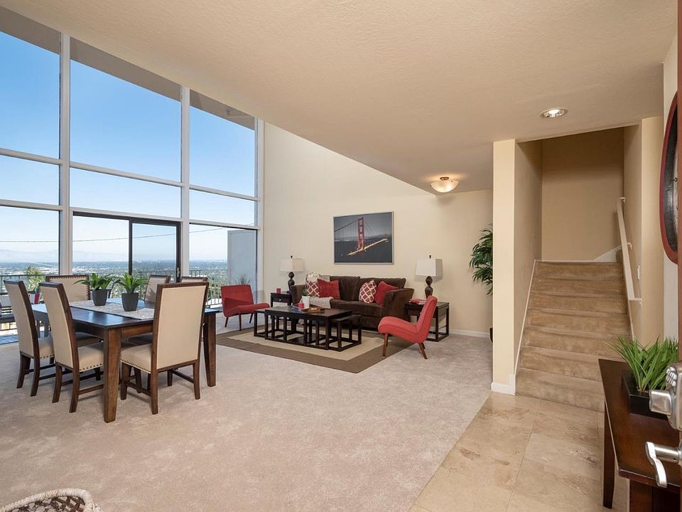 You will love the amazing views of Bay, mountains and city lights from 18 foot floor to ceiling windows! This 2 level, 2 bedroom/2 bath unit includes a Loft which will serve as a 3rd bedroom or family room-complete with a private office nook, a customized double door closet and an additional single closet. Beautifully remodeled Kitchen and bathrooms with granite counters, stainless steel appliances and ceramic tile floors. Spacious living room/ dining room combination provides for an open floor plan. The incredible panoramic view can be enjoyed from the private deck off living and dining room, loft and deck with bbq space at front door entry. A walk-in utility room off of kitchen includes laundry area, storage and pantry. Note, 2 assigned covered parking spaces with extra storage. Wonderful community in a small complex with swimming pool, a few minutes away from Heather Elementary, Highlands Park and downtown San Carlos! Low Association fees and resort style swimming pool!