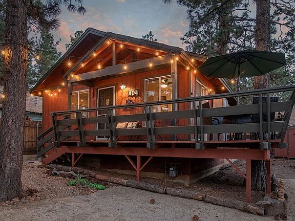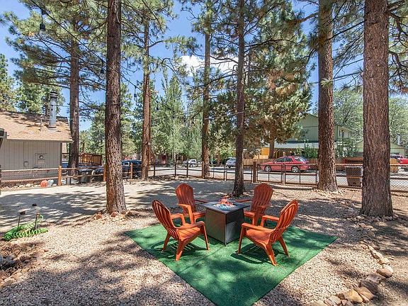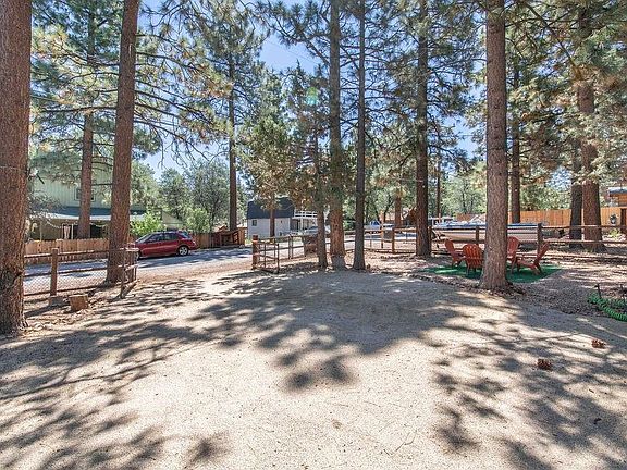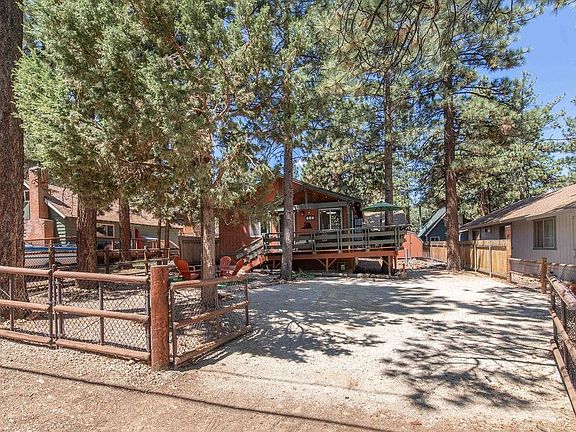 Relax and enjoy your new Big Bear Mountain home full of mountain charm! Ready to move in, just bring your toothbrush! Natural stone fireplace, open floor plan, access to deck & grille through sliding door off the kitchen. Many upgrades including new vinyl wood-look flooring, pine plank ceilings throughout, remodeled bathroom with handcrafted vanity and rustic modern shelving, handcrafted natural pine bathroom & bedroom doors, rustic hand-crafted furnishings. New ceiling fans in every room. All new paint inside and out including decking. New shed for plenty of storage. Fully fenced oversized treed lot with outdoor hanging lights and a propane fire pit table with chairs ready for you to unwind and experience the serenity of the mountains....Don't miss this one!