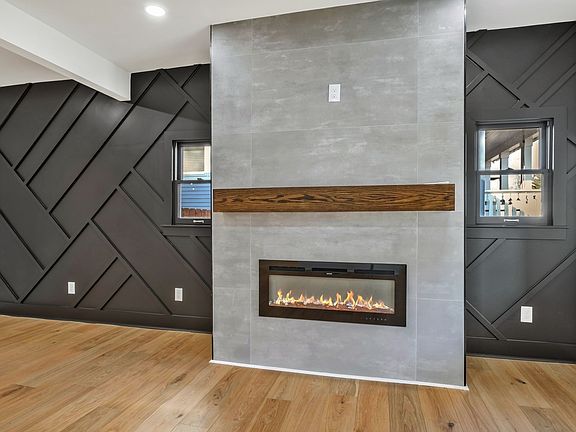 The designer kitchen features 42-inch soft-close cabinetry, quartz countertops, custom tilework, and high-end stainless-steel appliances. Bathrooms are fully updated with modern fixtures and custom tile. A stylish fireplace and custom wall features add warmth and character to the open living space.