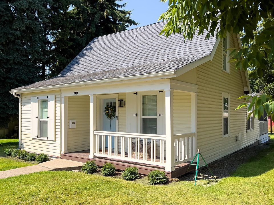 Nestled in a prime location, this charming home effortlessly blends historic allure with modern comforts. Step inside to discover quality restoration at its finest, featuring new paint, a new refrigerator, and plush new carpet. The inviting maple flooring and tile entrance set the stage for the elegance within. The bathroom boast stylish tile floors that offer the luxury of in-floor heating. The vaulted ceilings and shiplap walls add character and warmth to the living spaces. Enjoy the serene beauty of the outdoors from the beautiful covered and screened-in back deck. Just a short distance from the local park, this home is perfect for those seeking a blend of small-town charm and contemporary convenience.