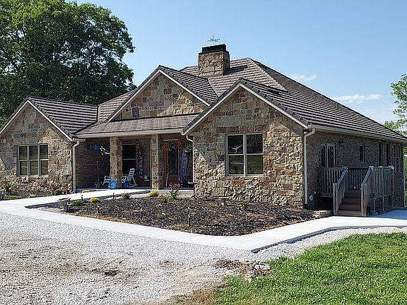 Beautiful Brick & Stone Home Situated on 10 Acres just minutes from Ozark, Views with lots of Wildlife! Home offers 6 Bedrooms with 2 Master Suites on Main Level, 4 1/2 baths, all bathrooms have heated floors, granite counter tops throughout, elevator, two kitchen aid ovens, gas grill/kitchen aid, Bosch dish washer, hardwood floors, massive stone wood burning fireplaces, elevator, beautiful lead glass windows throughout. Finished Basement includes second living area, kitchen, laundry room, stone fireplace pizza oven, two new hot water heaters and salt water system installed October 2021, two storm cellars, two side porches with trex flooring, back porch includes trex flooring, foam insulation throughout attic and exterior walls and stunning views of rolling terrain & natural forested areas create privacy at this end-of-the-road get-a-way. Just 30 minutes from Branson!