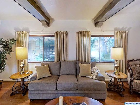 - LIVING ROOM: Built-Ins, Blinds, Drapes/Curtains, Fireplace, French Door, Beamed Ceiling