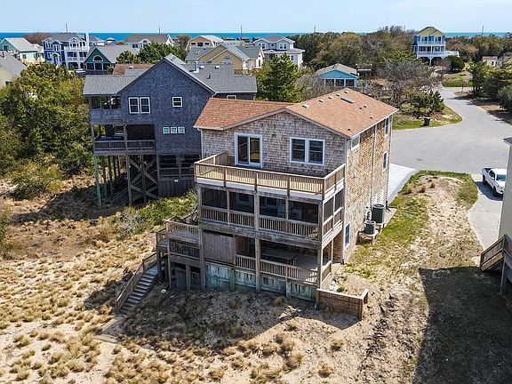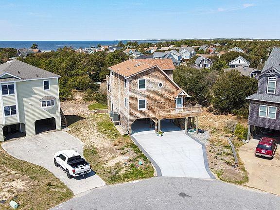 Tucked away on a serene hillside CUL-DE-SAC in the coveted OLD NAGS HEAD COVE community, this exceptional property is a MUST-SEE! Elevated on a bluff, it boasts breathtaking PANORAMIC VIEWS OF THE ROANOKE SOUND and the historic shores of Roanoke Island. At 21 FEET ABOVE SEA LEVEL, the expansive second-level screened porch—accessible from the dining room, living room, and kitchen—offers an ideal spot to take in the stunning scenery. For an even more unforgettable experience, step into the ELEVATOR and head up to the third-level deck to enjoy spectacular sunsets and the mesmerizing night sky of the Outer Banks. And to top it off, you’ll have a front-row seat to the 4th of July fireworks show, with perfect views of Manteo, Nags Head, and Kill Devil Hills displays. Impeccably maintained by its original owners, this charming classic saltbox was built in 1989 by Jeffrey Haskett, owner of Haskett Homes, Inc. In 2017, Haskett Homes completely renovated and expanded the property, bringing it to its impressive 2,544 square feet. Starting at the top, LEVEL 3 boasts thoughtfully designed spaces, including an expanded en-suite bedroom with a double walk-in tiled shower, a walk-in closet, and private access to the sundeck. A second en-suite bedroom with a skylight offers additional comfort, and a spacious office with an elevator provides access to all three levels. From the office, step outside onto the sundeck for stunning views of the sound. Upon re-entering the home, a welcoming loft with a sofa bed and TV rounds out the level 3 features. As you walk along the balcony overlooking the open and airy living and dining areas on LEVEL 2, you descend into a completely open floor plan that sets the stage for entertaining and lovely family gatherings. The flow into the fully updated kitchen is seamless. A CHEF’S DREAM, the kitchen features custom cabinetry, modern stainless steel appliances, a wall oven, a large island, a pantry, and an additional storage room. Level 2 also features a bedroom with a full bath that conveniently serves the living areas. LEVEL 1 is accessible via the interior spiral staircase next to the elevator or through the dry entry in the carport. This level features a cozy bedroom with two double bunks, a full bath, and a spacious laundry room with a washer, dryer, and chest freezer - all new in the 2017 renovation. From the back door, step out onto a ground-level patio and enjoy a large outdoor shower, perfect for rinsing off after a day at the beach or a visit to the community soundfront pool. The front carport offers ample space for two vehicles and includes a generous storage room that doubles as a storage shed. Adjacent to the carport is a WHOLE-HOUSE GENERAC GENERATOR fueled by the seller-owned 250-gallon propane tank, also fueling the TANKLESS ON-DEMAND RENAI WATER HEATER. The home’s layout is well-designed, with multiple staircases providing easy access to decks and entries both front and rear. The newly landscaped yard, complete with terraced garden boxes, offers a lovely setting for outdoor entertaining or a peaceful summer garden retreat. Please refer to the SELLER UPGRADES in the associated documents for a complete list of over $300,000 in improvements made since 2017. Don’t miss out on this rare opportunity to view a beautifully maintained, move-in-ready, furnished home in the heart of Nags Head. Schedule your appointment today! Take 30 seconds out of your day to enjoy the sound-side views from the video by pasting this link into your browser: https://www.youtube.com/watch?v=mxsntO5Hdck THANK YOU!