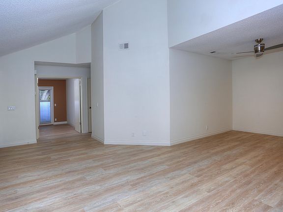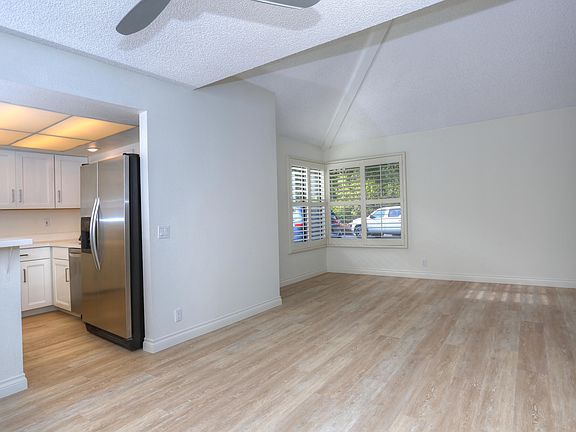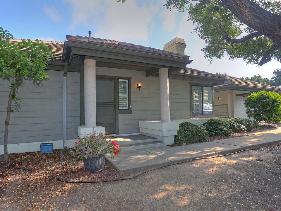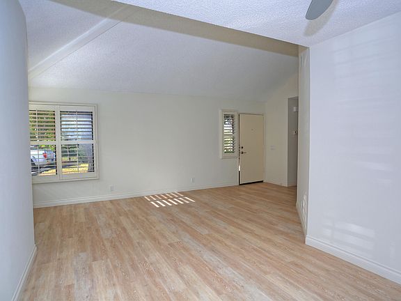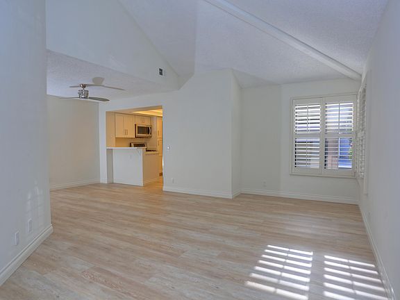 Available mid January. Single-level 2 bedroom, 1 bath end unit with vaulted ceilings, plantation shutters and wood-like flooring. Updated kitchen. Both bedrooms open to a spacious patio. Laundry room with washer and dryer. Attached one-car garage with additional one-car parking spot and community pool. Utilities not included. No pets. No exceptions. One-year lease. Deposit $3600. Please Do Not Disturb Occupants.