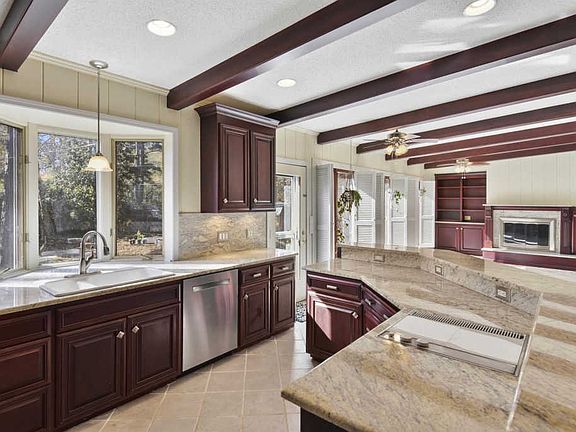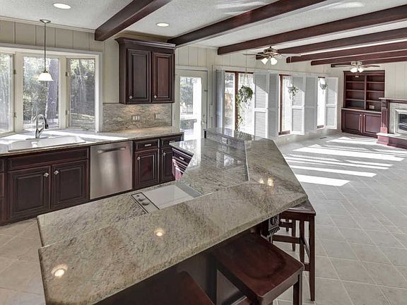 - RoomKitchenFeatures: Granite Counters, Kitchen Island, Fireplace, Eat-in Kitchen, Cabinets-Stained, Bar, Floors-Tile, Backsplash-Granite