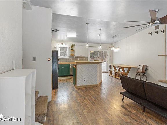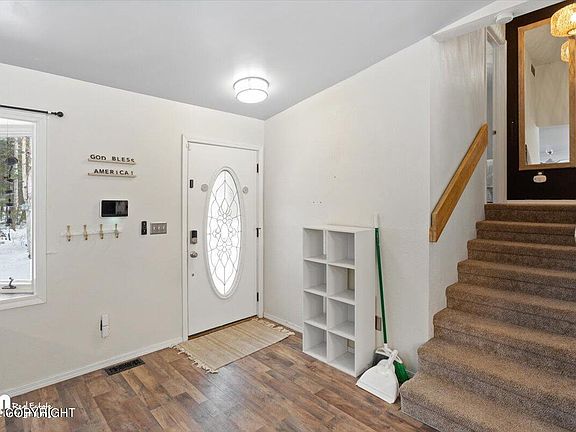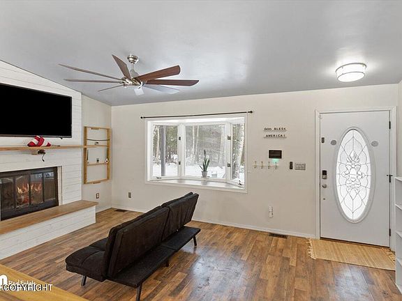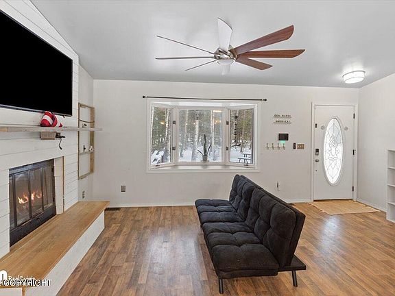 Great Home on Spacious and Private 1+ acre lot. Quiet neighborhood, just minutes from downtown Wasilla. This home features an updated living on the main level with open concept floor plan, wood fireplace and vaulted ceilings. Upstairs features 2 bedrooms with 1 shared full bathroom. Downstairs features a flex space that could be used as a second living area or third bedroom,full bathroom/laundry combination, and a storage room/office space. Plenty of room to park your toys, or add a garage/shop outside. Furniture in home may be available for purchase. Upstairs bedroom headboard is attached to the wall and stays with home. 3 bedroom septic replaced in 2019.