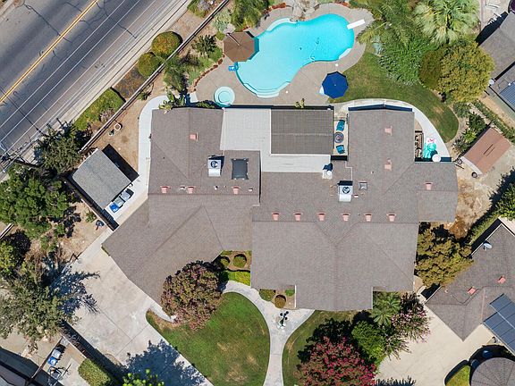 Located in the prestigious Millwood neighborhood, welcome to 4040 W Robinwood Ct - an extraordinary home featuring charming curb appeal, spacious living quarters, and modern amenities. Nestled in a charming cul-de-sac; this home sits on over one third of an acre right in the heart of NW Visalia. Stunning curb appeal from the spacious driveway to the exquisite vaulted front porch, the home is beyond welcoming and truly breathtaking. Inside, just off the foyer, you will find a spacious office and formal living room. Make your way into the heart of the home where the beautiful updated kitchen is open to the spacious great room and dining room. On the south wing of the home you will find the primary bedroom which features a large walk-in closet and a private en-suite. Tucked in the north wing you will find four spacious bedrooms and two guest bathrooms. Fully equipped with smart home features, the ovens are wifi enabled and can be set remotely, and easily set custom commands with the Alexa device controlled using voice throughout the home! Throughout the home the features include; crown molding, granite counters, wood-beamed vaulted ceilings, smart home features, skylights, storage, and custom built-ins. No stone has been left unturned! The backyard encapsulates the beauty, charm, and amenities of this dream home. The enclosed covered patio is plenty spacious to host and entertain family and friends throughout all the Central California Seasons. Custom landscaping and cement pathways to each side yard, multiple storage sheds, the list goes on! End the summer in the pool of your dreams with a stunning waterfall, diving board, and a spa to spend year round relaxing after each day. This home is turn-key ready for a new owner, ready to view in person so book a private tour today!