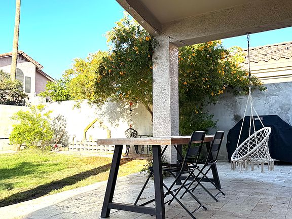Step outside and you'll feel like you've left the desert behind. The backyard is fully landscaped with pavers for easy walking, a healthy green lawn, and charming features like a lemon tree and desert bushes. The front yard is equally inviting with a flat, grassy lawn perfect for relaxing or walking.