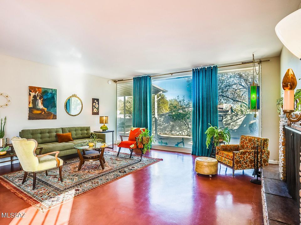 Located in the Highly Desirable Historic Community of Poet's Corner, This Sleek and Sophisticated Midcentury Charmer with Guesthouse Sits on a .31 Acre Corner Lot with Mountain Views. The Two Bedroom/Two Bath 2,000+ Square Foot Main House Features Expansive Ceiling to Floor Windows and Glass, Original Concrete Floors, Updated Kitchen, Large Living Area, Stacked Sandstone Fireplace, Authentic Vintage Tile in Both Bathrooms and NEW ROOF! Bonus Room with Fabulous Wood Beam Ceiling Can Be Utilized as Family Room, Third Bedroom, Formal Dining, Den or Artist Space. Adorable Detached Guest House Offers Micro-Kitchen, 3/4 Bathroom, Washer and Dryer, Private Yard and is Ideal Live-In Studio for Guests or Students, and Provides Income Opportunity as a Short or Long Term Rental. Click for MORE INFO > Within Walking and Biking Distance of Many Landmarks in The Old Pueblo: Reid Park, UArizona, El Con and Park Malls, Downtown Tucson, 4th Avenue. What More Could You Want?? Well There's Also a Jacuzzi, Driveway with Pavers, Covered Parking, Rolling Gate, Walled In Yard and Workshop! This Retro-Contemporary Residence is Fun, Funky and Functional! Are You Ready To Swoon?
