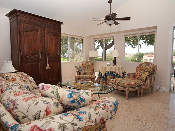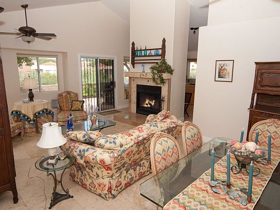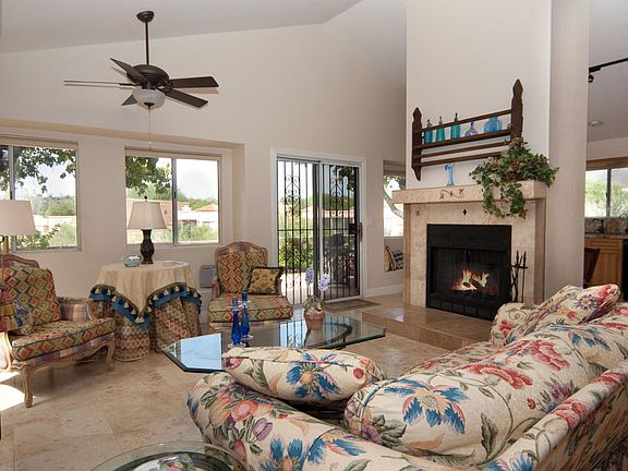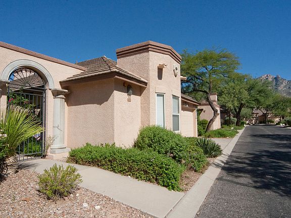 Located in private and peaceful area of gated La Paloma. This home has excellent city and mountain views. Ceramic tile througout. Open kitchen with mountain views. Comfortable living room with fireplace. Three windows with built in seating areas. Nicely landscaped yard that blooms and blooms. Would be a really good permanent home or a lock and leave for a second home.