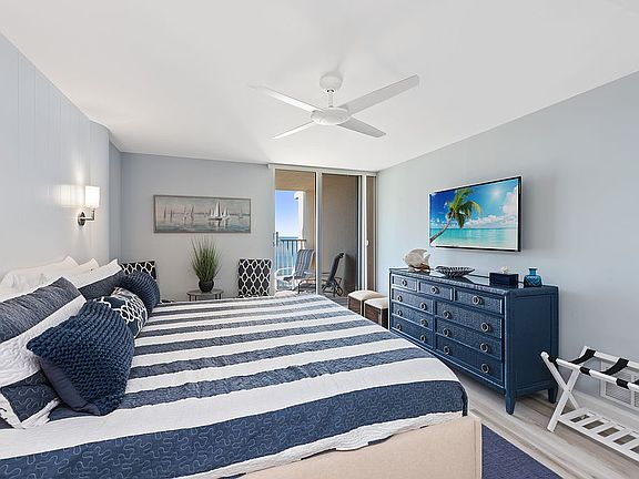 The 18th floor residence comes with amenities such as: access to the state of the art condominium gym, executive conference room, spacious kitchen access for hosting guests, large beach side pool access to soak up the rays, and lovely white sand beach views from the balcony. Wanting to add some more activity to your day? Tennis courts, pickleball courts, and bocce courts are available to guests. Spend time at the two large cabana and cookout areas with friends or guests. In addition to the previously listed amenities, there is access to a 2.5 mile concrete beach walk within 100 yards of the property.