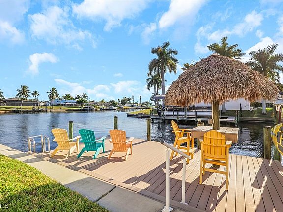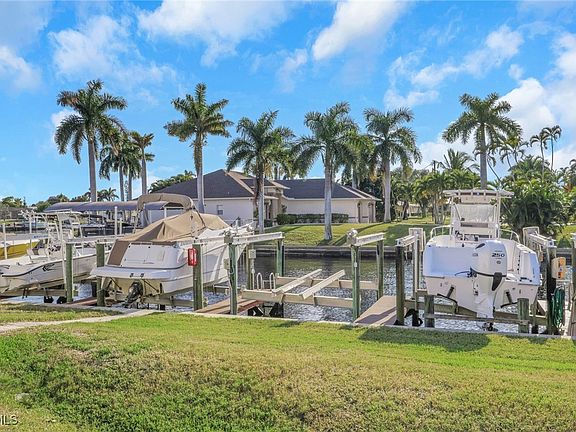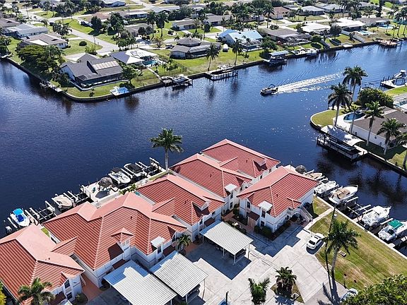 RARE FIND! This beautiful waterfront 3 BEDROOM 2 BATH first floor condo has it all, including your own DEEDED BOAT DOCK with 16,000 LB LIFT! This condo sits on intersecting canals located on the wide Rubicon canal. NEW TILE ROOF 2025. NEW SEAWALL replacement 2019. NEW AC UNIT 2025 and NO FLOOD INSURANCE required. This is indeed a rarely found opportunity in Cape Coral, enjoy the easy Gulf access canal right outside your back door! Only 13 minutes to the Caloosahatchee River (one bridge) for great fishing and boating enjoyment. Great Room style floor plan with beautifully updated kitchen featuring quartz countertops. Crown molding encases the main living area. Master suite features sliders to the lanai, walk-in closet, large bath with dual sinks/vanities. You'll love the lanai w/Eastern exposure & NEWLY INSTALLED LANAI SLIDERS which really expand the living room space and enjoy the sunny & warm Florida breeze. The lanai can be used all year round, either enclosed or opened up for outdoor enjoyment. The complex includes a community pool & spa/hot tub overlooking the canal, BBQ & 2 Tiki Docks / Huts. Low HOA fees in a well managed association with only 14 units.