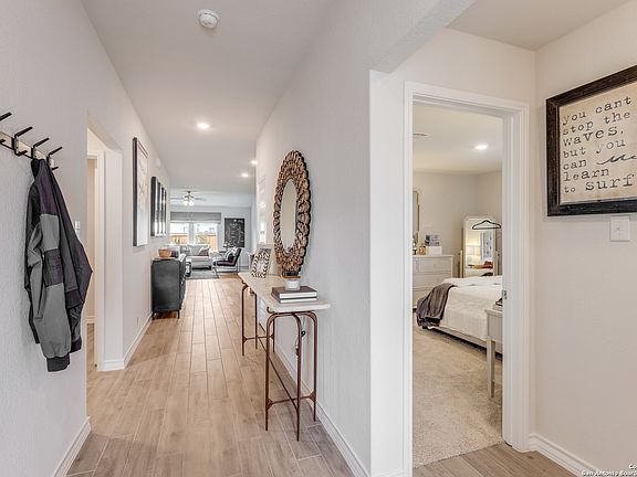 The Irvine is a single story 1,796 sq ft home offering 4 bedrooms and 2 baths. This home features a long foyer leading into the kitchen. The open kitchen overlooks the living and dining area and features spacious granite countertops, stainless steel appliances, decorative tile backsplash, and walk in pantry. Enjoy the first bedroom suite located off the family room, featuring a huge walk in closet and large walk in shower. The Irvine comes with a covered rear patio giving view to the professionally irrigated and landscaped yard complete with Bermuda sod. You'll enjoy added security in your new home with our Home is Connected features. Using one central hub that talks to all the devices in your home, you can control the lights, thermostat and locks, all from your cellular device. Additional features include, tall 9-foot ceilings, 2-inch faux wood blinds throughout the home, full yard irrigation, radiant barrier roof decking, and pre-plumb for water softener loop.