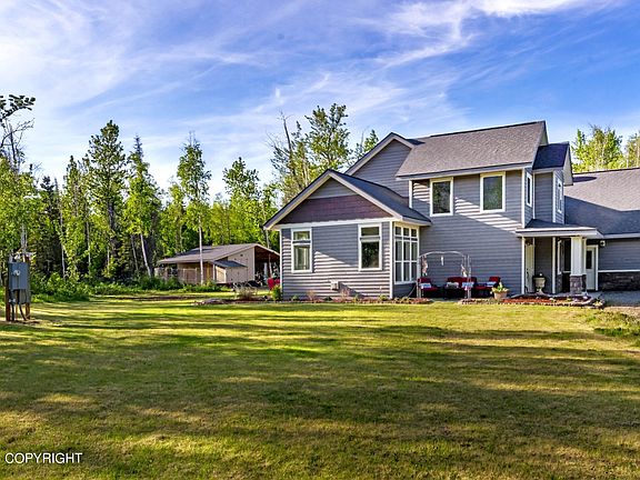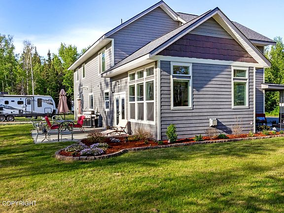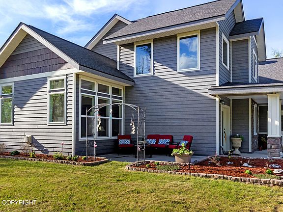 Park your trucks, cars & toys in the 1300 sf drive thru garage! This is tucked away on a private nearly 3 acre lot with many upgrades: wood floors, urethane insulation, cabinets, doors & trim work, central vac, on demand water and in floor heat in the house and garage. With a 4 bedroom septic, the large bonus room or office could be used as a 4th bedroom. Sellers are licensed to sell in AK.Exterior - upraded two tone prepainted lap siding w rock accents, enclosed vinyl soffit, 10k watt stand-by generator with it's own panel that turns on automatically when the power goes out. Garage - primed walls, doors upgraded to 18.4 R-value. The 8'door is on the back of house so you can drive completely through garage. Interior - 2 story entry, 11' foot coffered ceiling in great room, 9' walls downstairs/8' upstairs, solid wood doors throughout, wainscoting, windows wrapped and trimmed out downstairs, granite in kitchen and bathrooms, gas fireplace with built in cabinets & granite, master bed has tray ceiling with crown molding and rope lighting, master bath has linen cabinet, double sinks, 6' jetted tub, and 5' shower w body sprayers and 2 shower heads which have 6 different settings, 2nd bath has double sinks, and custom closet organizers in all closets. Kitchen - upgraded 42" cabinets, pantry with roll out drawers,soft close on all drawers and doors, custom hood vent, under cabinet lighting, tiled back splash, double oven and separate cook top. Walk in pantry with shelves.