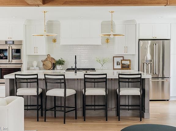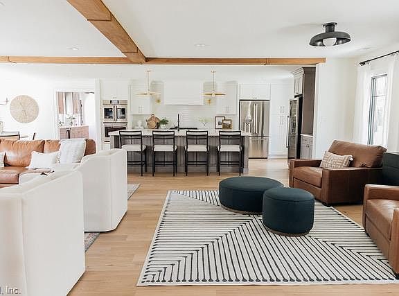 Perfectly located near highly sought-after dining, shopping, and entertainment—this one checks every box for luxury waterfront living. Completely remodeled and enlarged in 2023, this modern Craftsman blends luxury, convenience, and rare navigable waterfront living on an oversized lot in the heart of Virginia Beach. Enjoy an open floor plan with wide-plank white oak floors, chef’s kitchen with cafe appliances, butler’s pantry, and 125-bottle wine refrigerator. The main level offers 3 bedrooms, including a stunning primary suite with heated bath floors and dual walk-in closets, plus a private 4th bedroom over the attached 2-car garage. A new detached 2-car garage with attic storage adds even more flexibility. Upgrades include new roof, driveway, Anderson casement windows, 3-zone Trane HVAC, Cat-6 cabling, whole-home generator, and epoxy garage floors. Outdoors, enjoy architectural lighting, and a 24K lb boat lift (2024). Canal was dredged to 5’ depth (2024) for easy access to the bay.